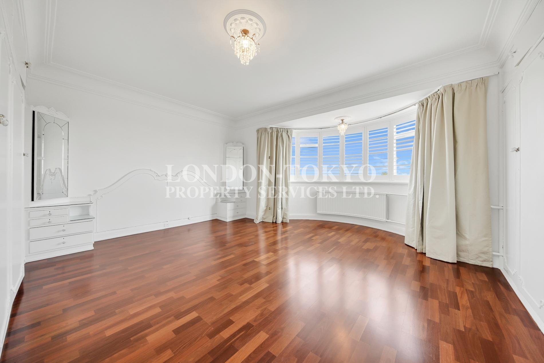 リージェンツパーク目の前に位置するセントジョンズウッドでも指折りの高級ブロック内上層階の広い3寝室フラットのご紹介です。新内装されたばかりの綺麗な室内、フローリングの室内、公園やセントラルの眺望が堪能できるリビング、広いキッチン、豊富な収納、大理石の浴室など、豪華な内装です。家具付き交渉可能。